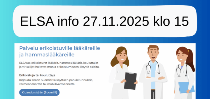 Tervetuloa työterveyshuollon erikoislääkärikoulutuksen ELSA infoon torstaina 27.11.2025 klo 15.00-16.00. Infossa teemana on ”Lokikirjasta ELSAan – valmistuminen erikoislääkäriksi”: Miten todistusta erikoislääkärikoulutuksesta haetaan...